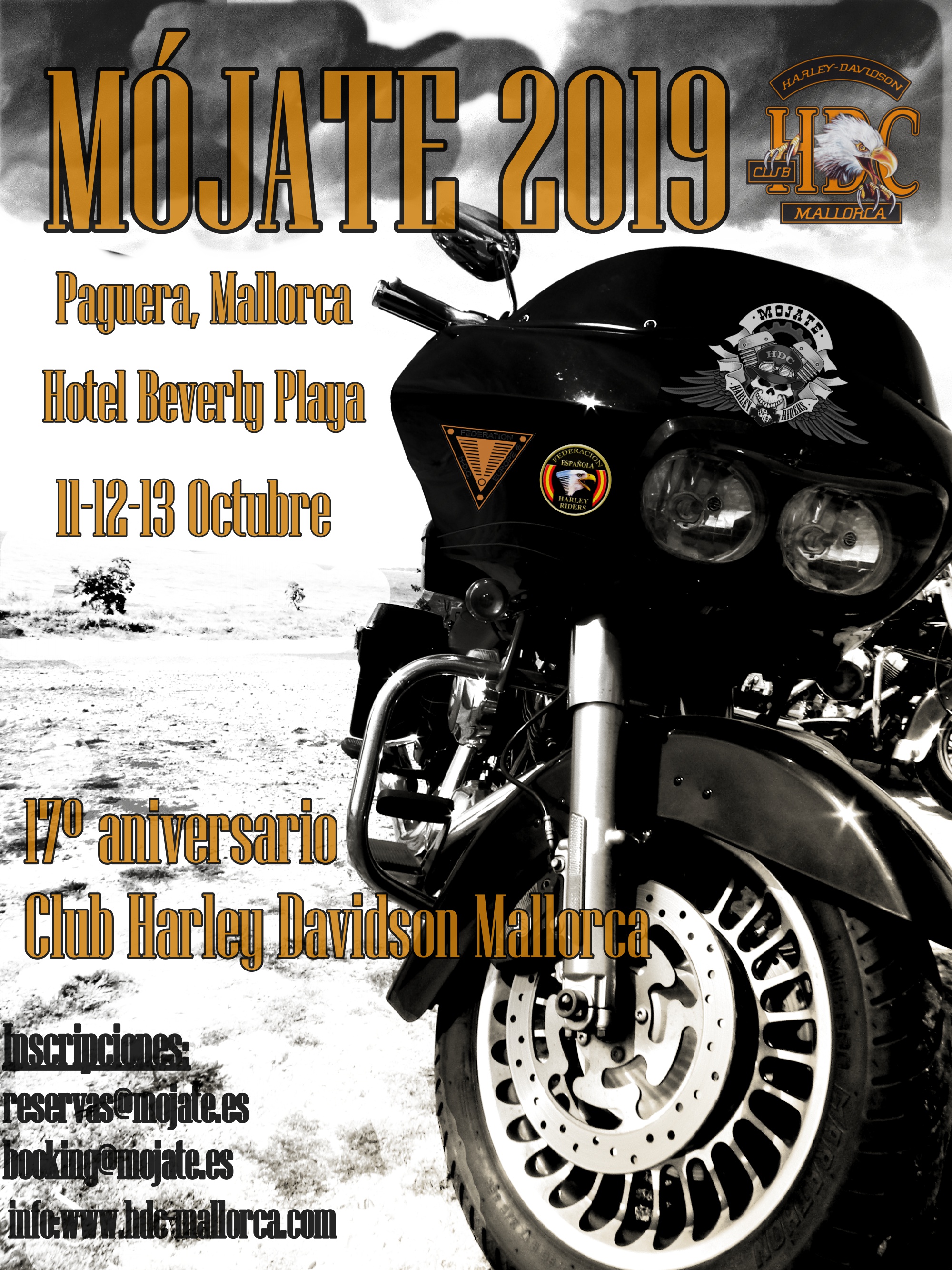 El Club Harley Davidson de Mallorca , fundado en el año 2002, organizamos cada año en Octubre la concentra Mójate, intentamos que sea la más divertida y entretenida , del panorama Biker internacional, una fiesta con personalidad propia, la mejor música, rutas por la isla , degustaciones de platos tipicos malloquines, sol y a veces algo de lluvia.....desde 2002 y hasta la fecha. Reserva unos días de Octubre para venir al Mójate...